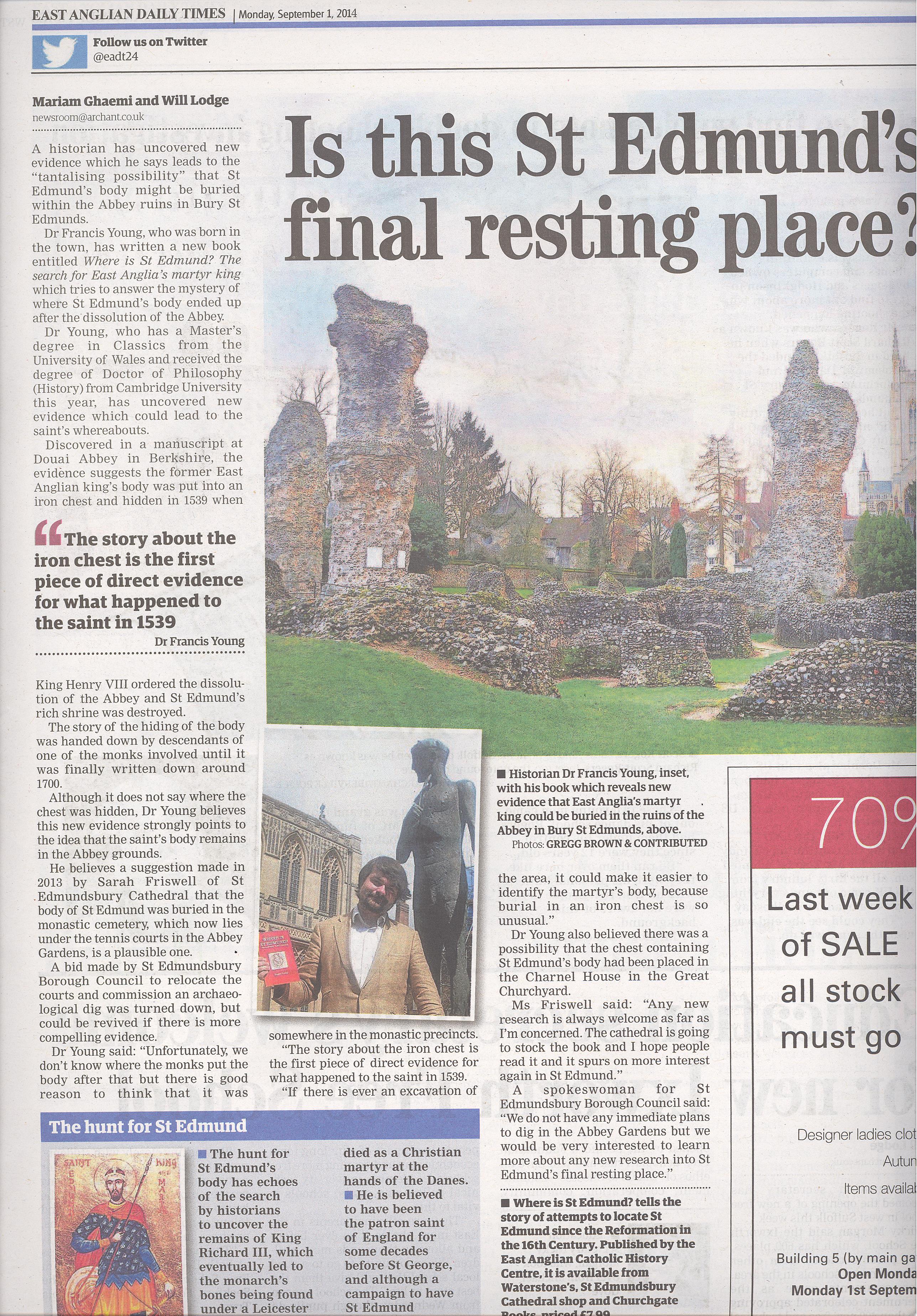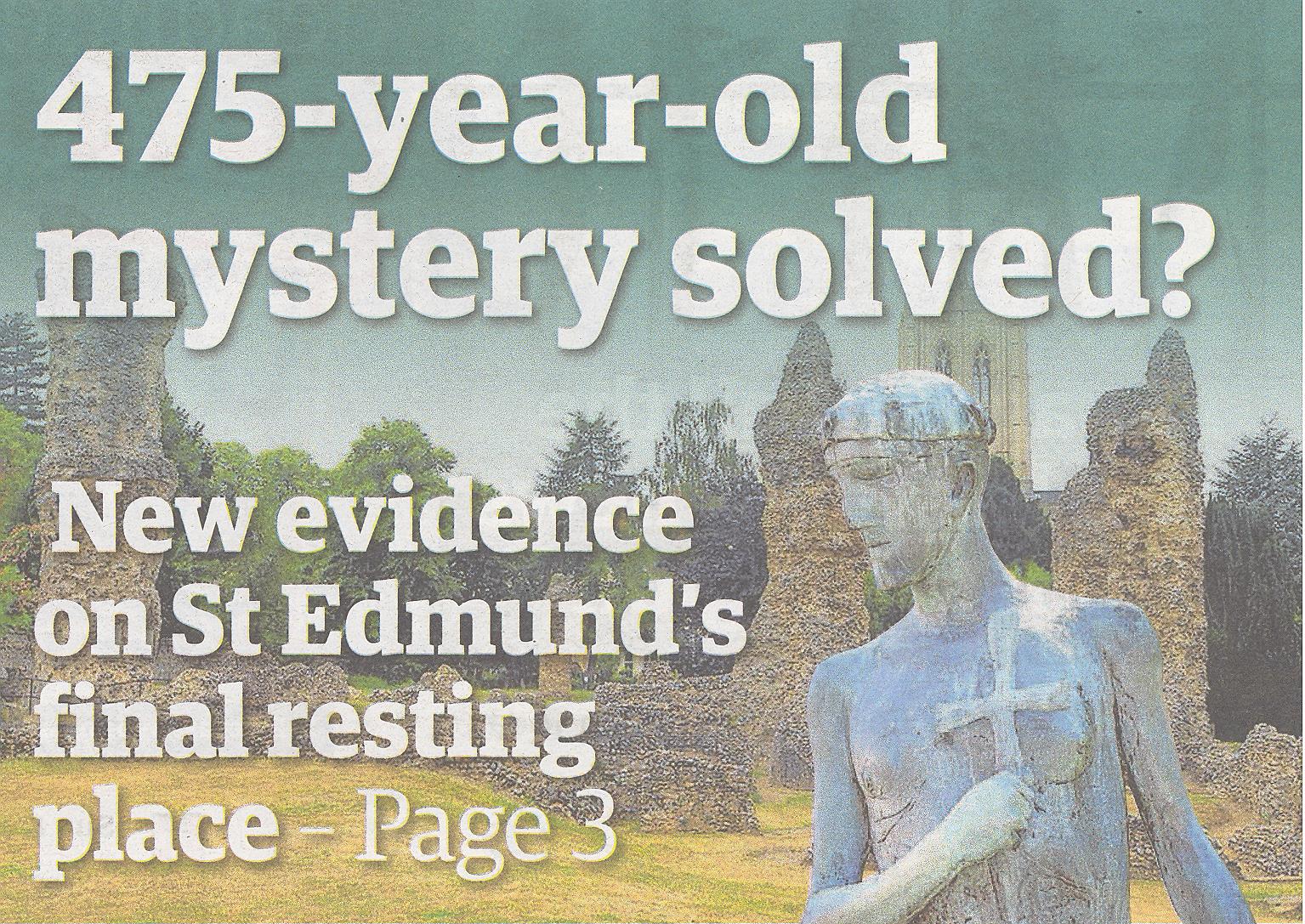 Today’s edition of the East Anglian Daily Times features a full-page article (on p. 3) about my new book Where is St Edmund? by Mariam Ghaemi and Will Lodge. In answer to the question posed on the front cover of today’s edition, ‘475-year-old mystery solved?’, I must say ‘No’, but hopefully the new evidence unearthed by my research can make our guesses slightly better informed. And that is usually as much as a historian can hope for.