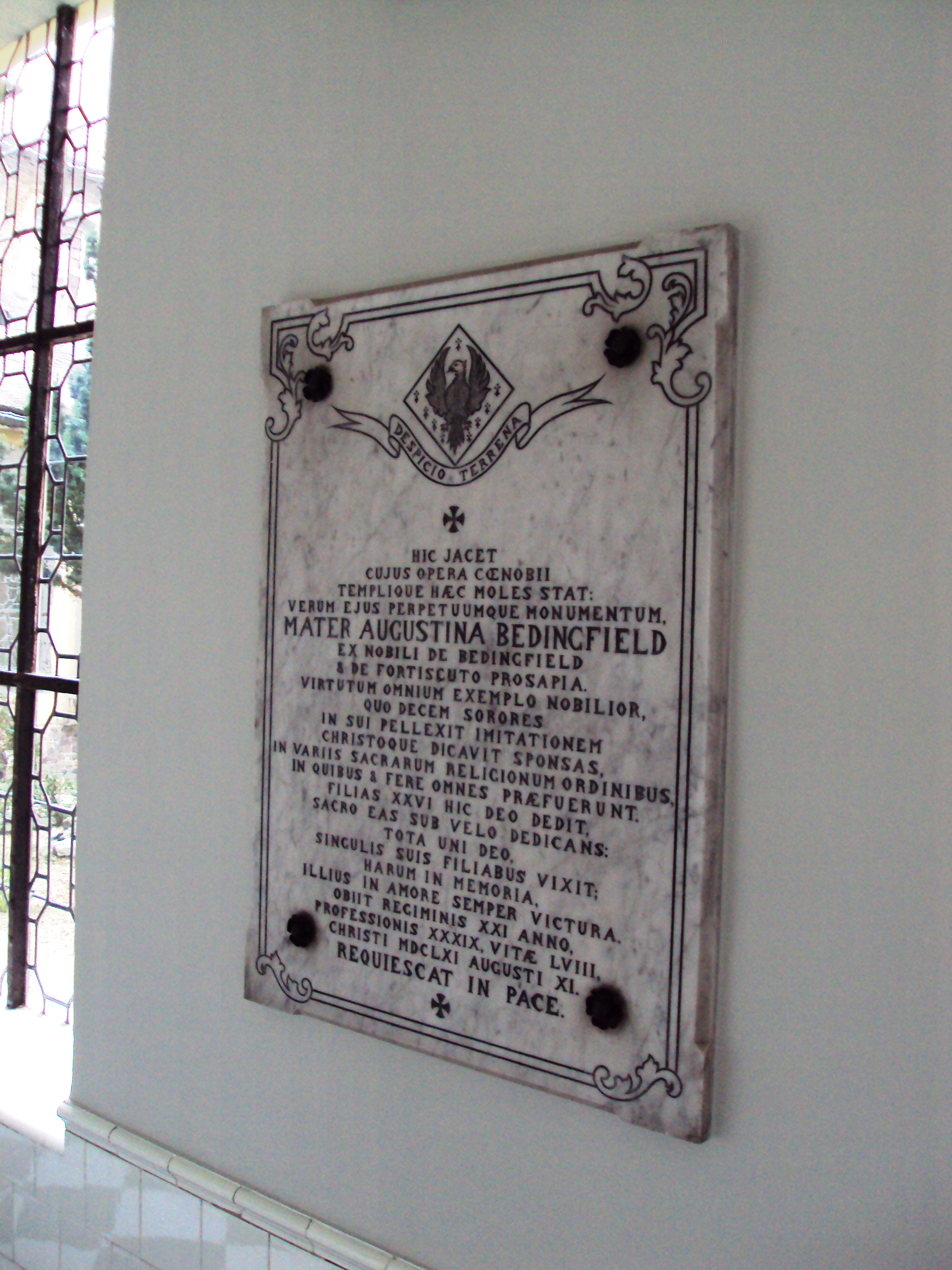 In the western antechapel, separated by a grille from the rest of the space, is usually located a much-venerated portrait of St Thomas More which was given to Mother More, who was the saint’s last direct descendent. The portrait is also venerated because Margaret Clement, the founder of St Monica’s, Louvain (Bruges’ mother house) was More’s adopted daughter. However, the painting was not only display when I visited, and I only saw the painting of Blessed Thomas Ford (d. 1582), a rather obscure martyr. Sr Mary Augustine was kind enough to allow me to see the chapterhouse, the statues of Ss Peter and Paul on the main stairs, part of the cloister (featuring a memorial tablet to Sr Mary Augustina Bedingfield) and a glimpse of the monastic garden, where there are stone tablets on the outside of the building with the names of all the nuns.