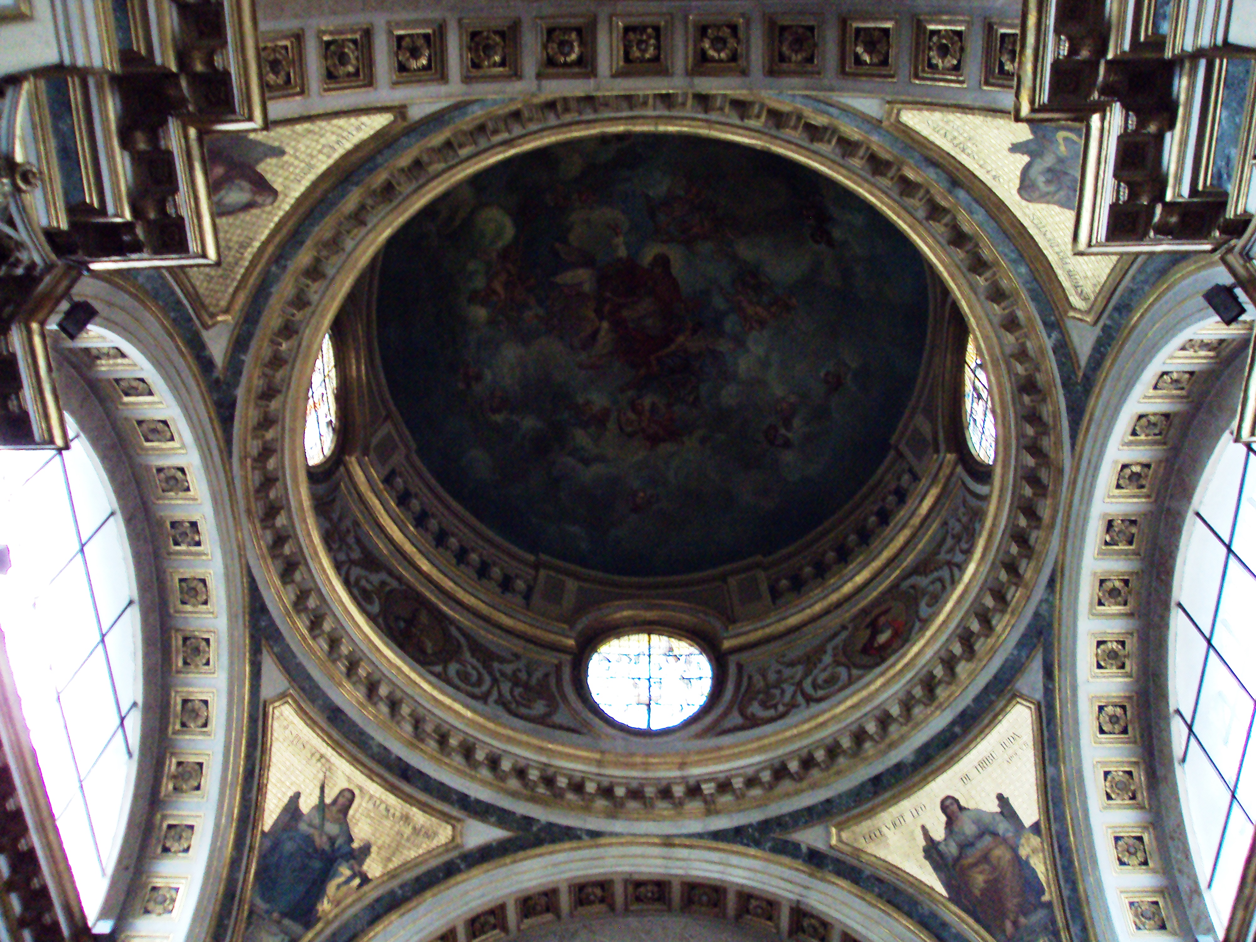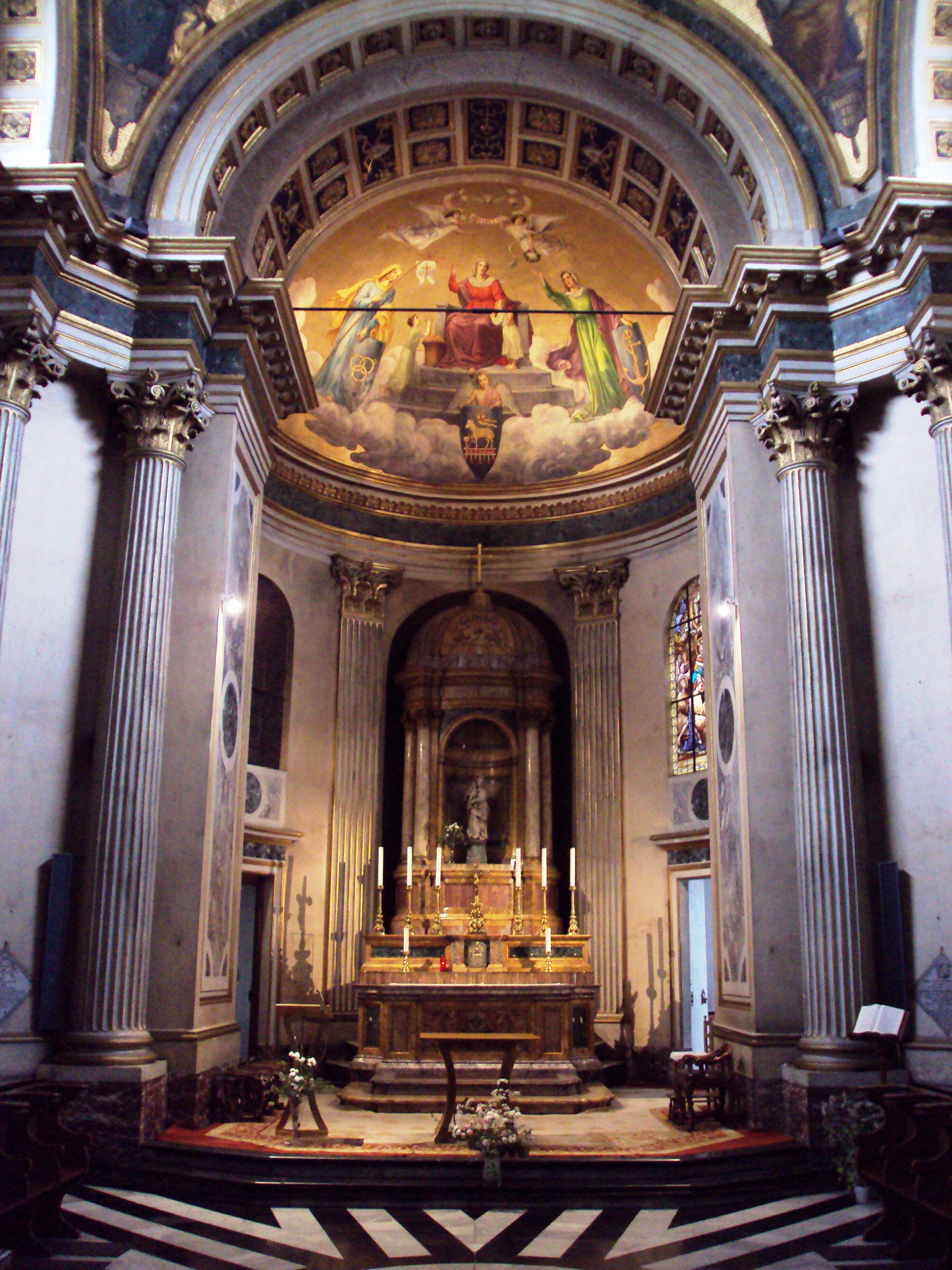 The convent church is entered via a small ante-chapel and a set of steps that lead up to the semicircular apse at the east end of the church, so that the first thing the visitor sees is the Carrara marble altar donated by the Countess of Nithsdale in gratitude for her husband’s successful escape from the Tower of London (his wife famously assisted his escape by dressing him as her lady’s maid). The apse above the altar and dome feature paintings which I judged to be of the first half of the nineteenth century in date, and indeed most of the interior features of the church would seem to date from after the French Revolution. Although one of the Canonesses, Sr Olivia Darell, stayed behind in Bruges throughout the Revolutionary period, she was unable to prevent the looting of the church. When the nuns returned in 1802 they had the entrance from the street (which was in the south wall of the main body of the church) sealed.