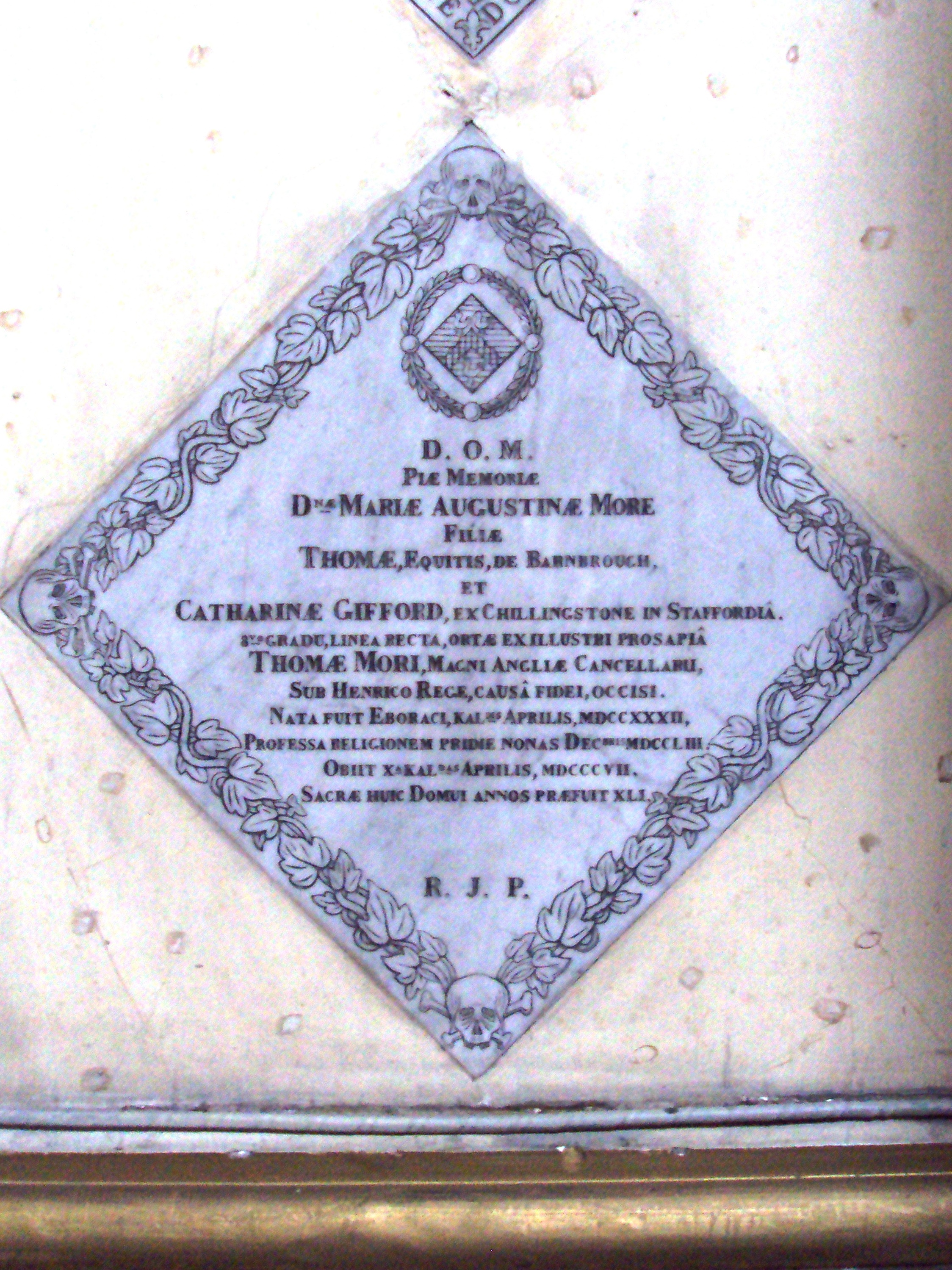 Prior to the Revolution, the convent was not only a religious community but also a church for the exiled Catholic community in Bruges. The present church was built in 1739 and paid for by William Herbert, Marquess (or Duke in the Jacobite peerage) of Powys, but the only interior decoration I was able to identify with certainty as dating from that era was the plaster ceiling in the antechapel at the west end of the church, which features a heart with a cross encircled by a crown of thorns (the emblem of the Order of St Augustine) and the date 1739. The black and white floor, with its impressive star design, may also be original as far as I know. The statue of Our Lady above the altar was, according to Sr Mary Augustine, left on the steps of the convent ‘about a hundred years ago’; from this comment I would guess that it was something looted by the French Revolutionaries and subsequently returned to a church by someone who felt guilty about the crime of sacrilege. The memorial tablets in the church are all post-Revolutionary, including one to Mother More in the southwest corner of the main body of the church. The stalls of the Canonesses are now located in this area, having been moved down from closer to the high altar after Vatican II.