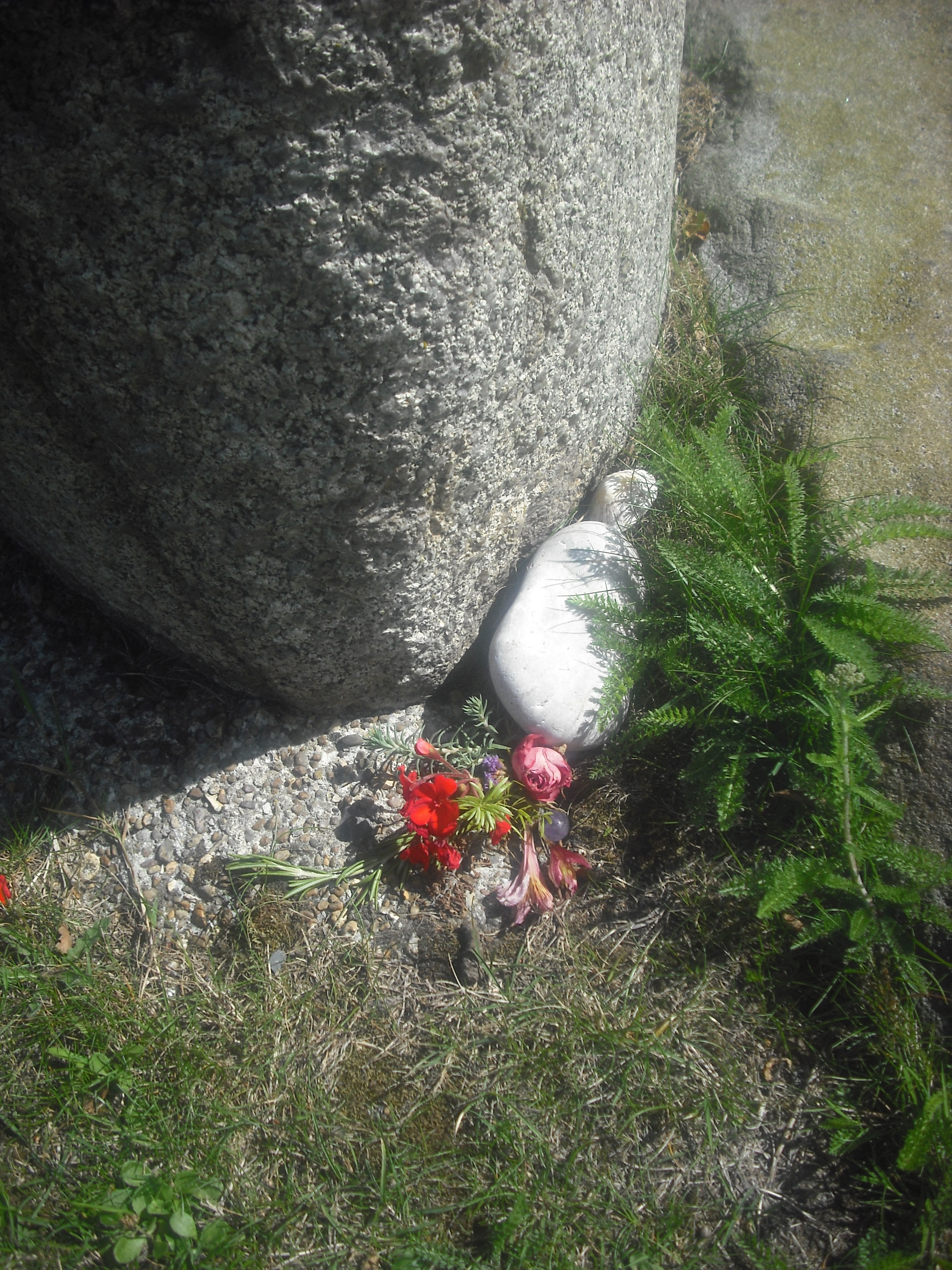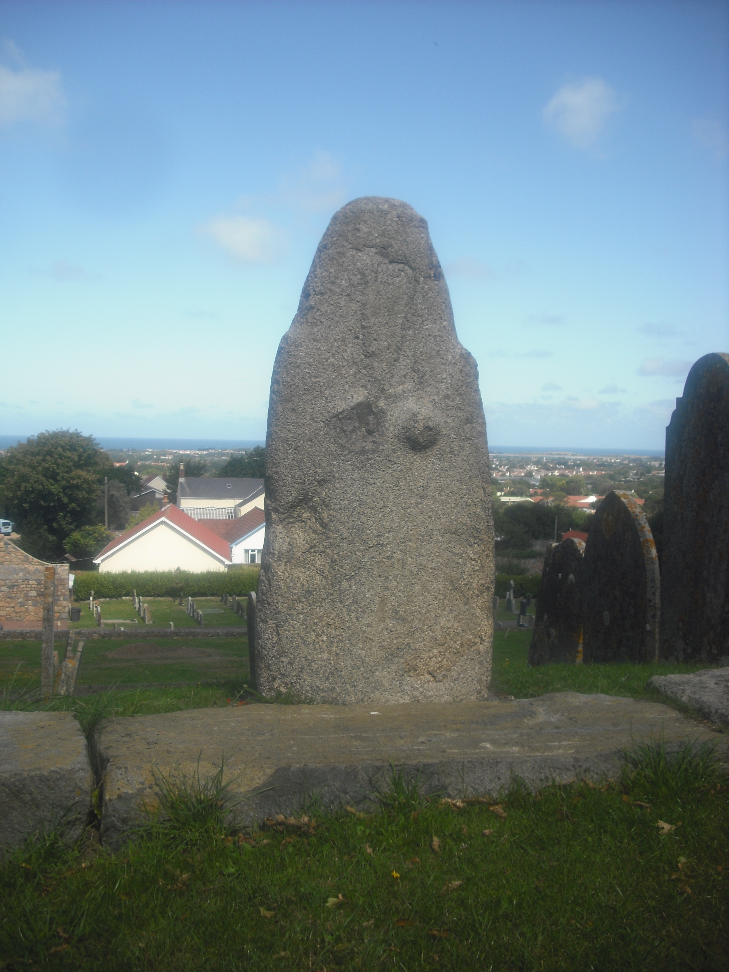 One place in the British Isles where I recently encountered the ‘paganising’ of historic sites was the island of Guernsey, which I visited in August 2014. In the churchyard of Castel Church, in the centre of the island, stands a menhir that seems to be an attempt to render the female form. I was surprised to see, at the foot of the menhir, flowers deliberately placed and held down by a stone, and apparently intended as some sort of offering.