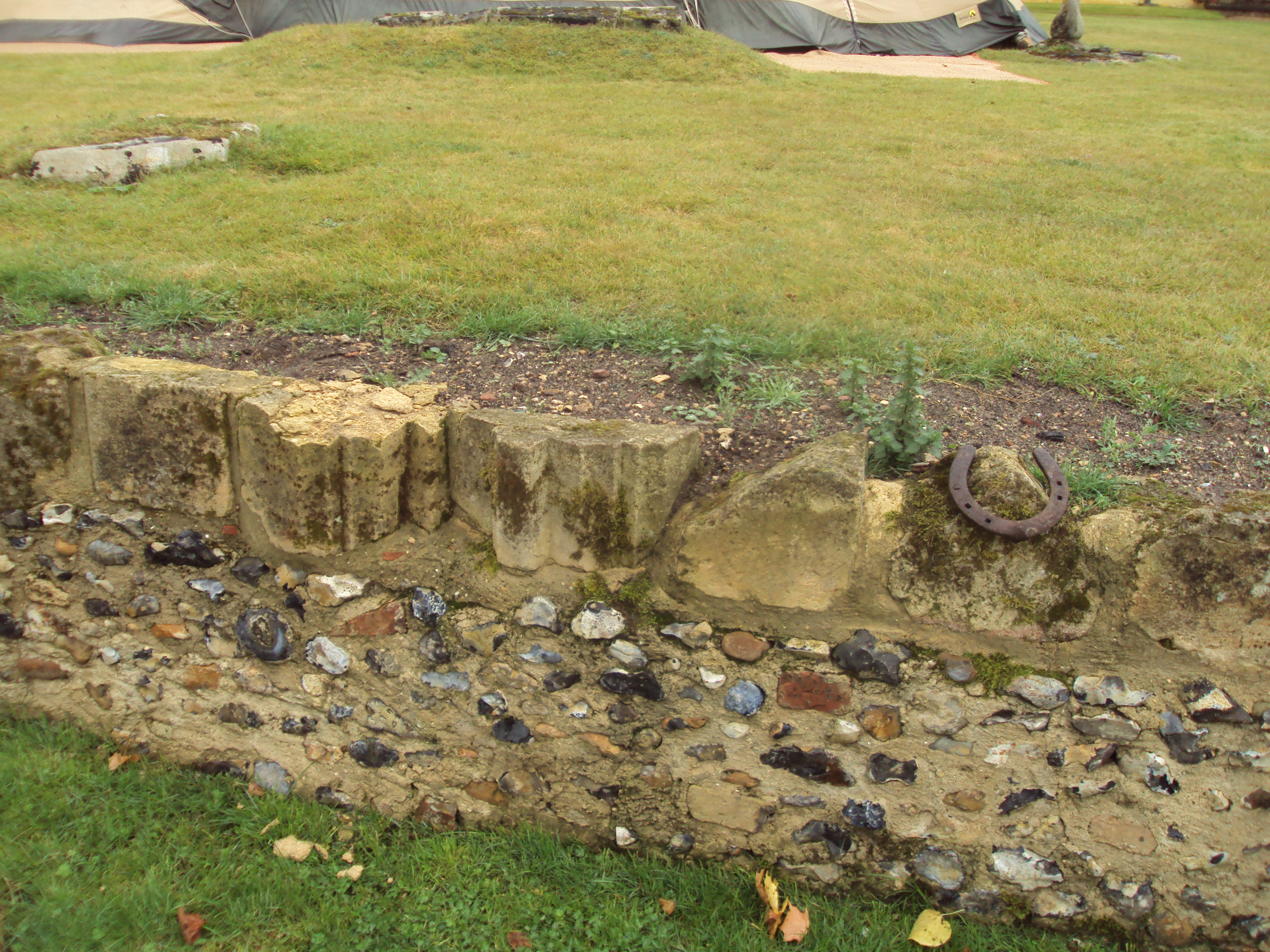 Yesterday I was fortunate enough to be able to see what remains of Ixworth Priory, which was incorporated into the post-Reformation house today called Ixworth Abbey. The remains consist of the west range and part of the Prior’s lodging. The west range stood to the south of the Priory church at right angles to it; in the middle of the west range, oriented east-west like the church, was the Prior’s lodging. The remainder of the house was added in the seventeenth century and was given its present appearance in the eighteenth. On the north lawn are what appear to be the remains of the Priory church, in the form of large octagonal bases for piers (one of which is now decorated with a sundial on a pedestal), and a number of medieval tomb slabs. Just beyond the tomb slabs the north lawn drops away to a cricket ground, with the edge of the lawn being marked out with pieces of reused stonework from the Priory.