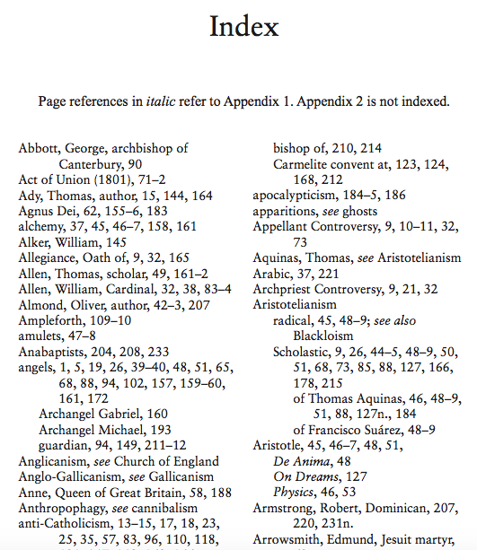 There are innumerable reasons why an analytical index is vastly superior to electronically searchable text, and I cannot cover them all. A human indexer takes note of places in the text where a theme is covered but the actual words associated with that theme do not occur. An indexer will spot where a synonym is used, and reference this in the index. And, crucially for monographs on early modern and medieval history including direct quotations in Middle English, an indexer will take note of variant spellings – something a searchable database cannot do. Indexes also have a role to play within electronic databases; if the index is scanned along with the text itself, then a search will throw up the term in the index, which will inform a scholar of places where something is covered that a brute-force search alone does not throw up. For this reason, it is just as important for e-books to be indexed as print copies.