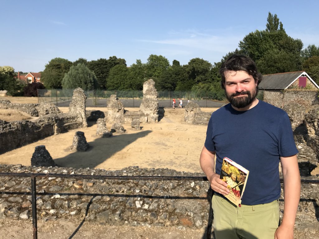 My research on the last resting place of St Edmund featured in this week’s episode of BBC Radio 4’s history programme ‘Making History’, presented by Tom Holland (listen from time signature 22:43). Tom and his producer paid a visit to the Abbey Ruins in Bury St Edmunds on the (very hot!) afternoon of Sunday 15 July, where Tom spoke to me about my hypothesis that Edmund may be buried under the tennis courts at the east end of the abbey church, which is outlined in my book Edmund: In Search of England’s Lost King.