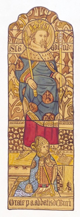 Whether or not the portrayal of Abbot Curteys at Brandeston comes from Bury’s Chapter House (which must remain speculation), it offers an insight into the commemoration of Curteys and other abbots in the reign of Abbot Reeve (1513-39), during whose abbacy this glass was probably made. It tells us that Curteys’s short life of St Edmund was still remembered, probably because the focus of Curteys’s Vita et passio S. Edmundi breviter collecta was the legal rights and privileges of St Edmunds Abbey – something that always preoccupied the monks of Bury.