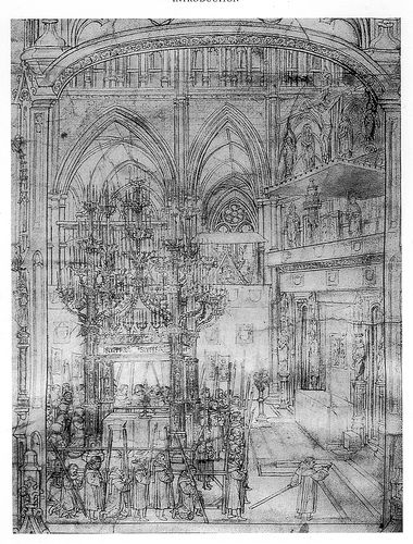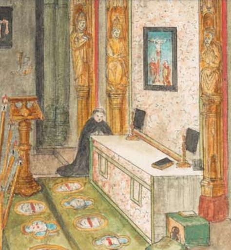 However, this second version of the Islip Mortuary Roll may give us a glimpse of something – or rather someone – else as well. One of the differences between the coloured copy and the original surviving roll is the presence of a kneeling monk on the north side of the abbey’s high altar in Vertue’s copy – no monk is present in the Westminster Abbey version. The illustration appears to portray the moment when Islip’s funeral procession reached the presbytery at Westminster – that holiest part of the abbey church where monarchs were crowned. The monk at the northern end of the altar appears to be in the most liturgically prominent position in the scene, and is therefore presumably John Reeve – who we know presided over the proceedings.
