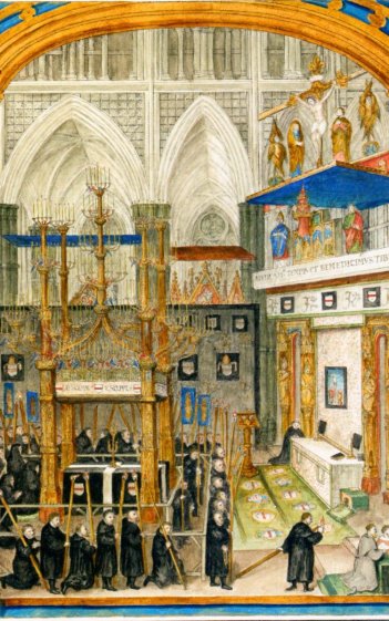 On 16 and 17 May 1532 John Reeve (alias Melford), the last Abbot of Bury St Edmunds (d. 1540) officiated at the elaborate obsequies for Abbot John Islip of Westminster (1464-1532) at Westminster Abbey. The funeral, described in British Library Add. MS 5829, was one of the grandest ever held for a Benedictine abbot in England, and has been called ‘the funeral of the Middle Ages’, insofar as it was one of the last great events of monastic England before the dissolution. A depiction of the event was recorded in a remarkable illuminated manuscript, the Islip Mortuary Roll, now part of the Muniments of Westminster Abbey.