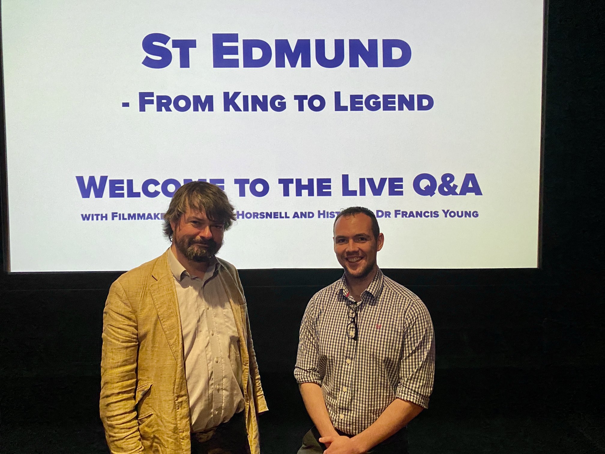 This evening I attended the premiere of Christian Horsnell’s documentary film ‘St Edmund: From King to Legend’ at Abbeygate Cinema in Bury St Edmunds. The film tells the story of the development and significance of St Edmund’s cult between 869 and 1020, when a Benedictine abbey was founded at Bury St Edmunds. Christian Horsnell interviewed me for the film early in 2020, and after this evening’s screening Christian and I both answered questions from the audience about the film and about St Edmund.