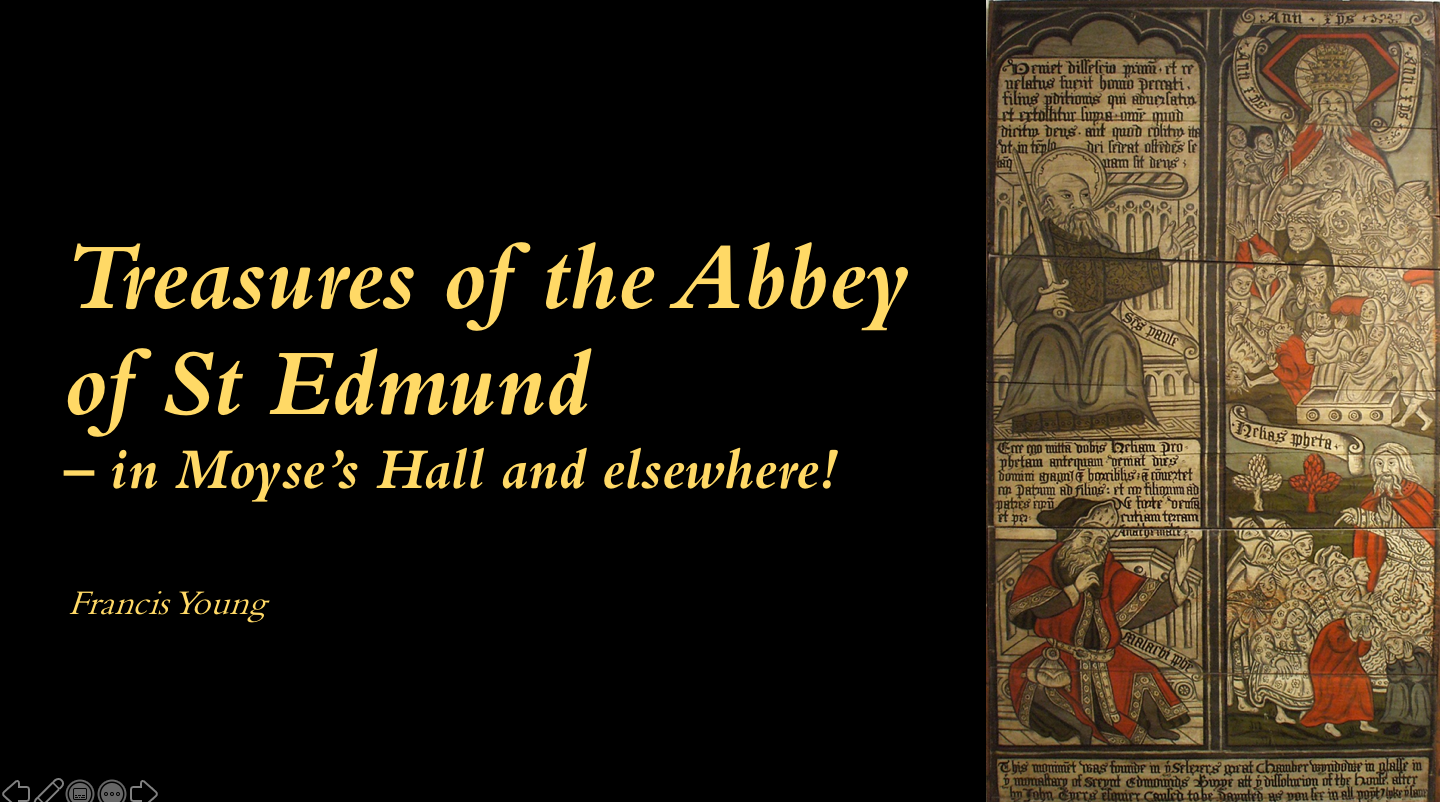 This evening I spoke at Moyse’s Hall Museum in Bury St Edmunds about treasures of St Edmunds Abbey: those lost before and during the dissolution, those which survive but are dispersed around the world, and those which can be found in Bury and indeed at Moyse’s Hall itself. I am grateful to all those who attended the talk and to Dan Clarke and the team at Moyse’s Hall for inviting me to speak on this subject.