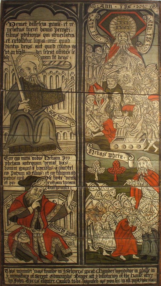 The visitor to Moyse’s Hall Museum in Bury St Edmunds will encounter a curious painted panel dating from around 1560 which is apparently a life-sized copy of one of the lost stained glass windows of St Edmunds Abbey, painted before it was taken down after the dissolution. The window stood not in the Abbey church itself but in the Cellarer’s Chamber, which stood for several decades after the Abbey’s dissolution in 1539. This particular window seems to have been copied on account of some unusual imagery it contains; it portrays the reign of Antichrist, and presents Antichrist (in the top right hand corner) wearing a triple crown resembling a papal tiara. By the early years of the reign of Elizabeth I, when the idea that the Pope was Antichrist was an established tenet of Protestant belief, the appearance of such a triple crown in a fourteenth- or fifteenth-century window was a matter of considerable interest; it bolstered the idea promoted by the Protestant martyrologist John Foxe that Protestantism was not a new phenomenon, but that a holy remnant of godly Christians had always existed within the corrupt medieval Church and had resisted the degenerate papacy. For Protestants with this historiographical agenda, the image in the Cellarer’s Chamber window was an astonishing find and a key piece of evidence for the existence of medieval Protestants avant la lettre.