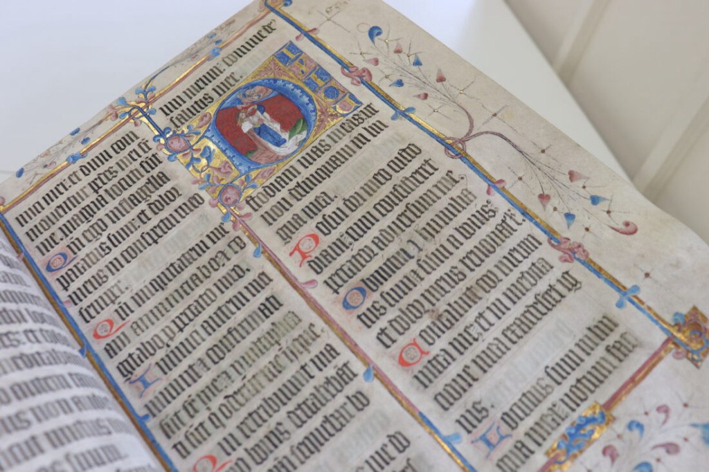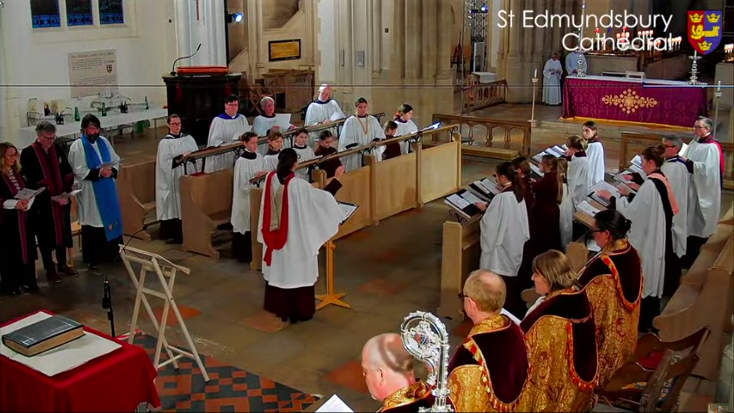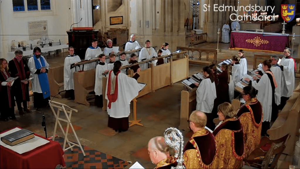 This evening I took part in a special Evensong at St Edmundsbury Cathedral at which the Cathedral formally took possession of the Bury Psalter, an illuminated manuscript of the Psalms created in the scriptorium of St Edmunds Abbey between 1399 and 1408. The Psalter survived the Reformation and, like several books from the Abbey’s library, found its way into private hands in the town until James Harvey gave it to the Bury School in 1706. Until recently the Psalter belonged to the King Edward VI Grammar School Foundation Trust and was cared for by Suffolk Archives, but an unwelcome consequence of Suffolk Archives’ move to The Hold in Ipswich (and the closure of the Bury St Edmunds Record Office) was that the Psalter, which is the sole book from the medieval monastic library that has never left Bury, would end up being taken away from the town. The Foundation therefore decided to give the Psalter to the Cathedral, whose Treasury provides a secure location for the Psalter to be conserved and displayed to the public. Although the Cathedral has a fine ancient library of early printed books (the former parish library of St James’ Church), it has never been in possession of a manuscript from the Abbey until now, so the Psalter forms a valuable link between the Cathedral and the ancient Abbey whose successor it is.